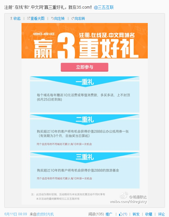 Leading Chinese registrar, 35.com has partnered with TLD Registry to run an intensive two week sales campaign. 35.com has an impressive sales-force of more than 1,000 salespeople in their Xiamen headquarters building, and more than 40,000 resellers around China.