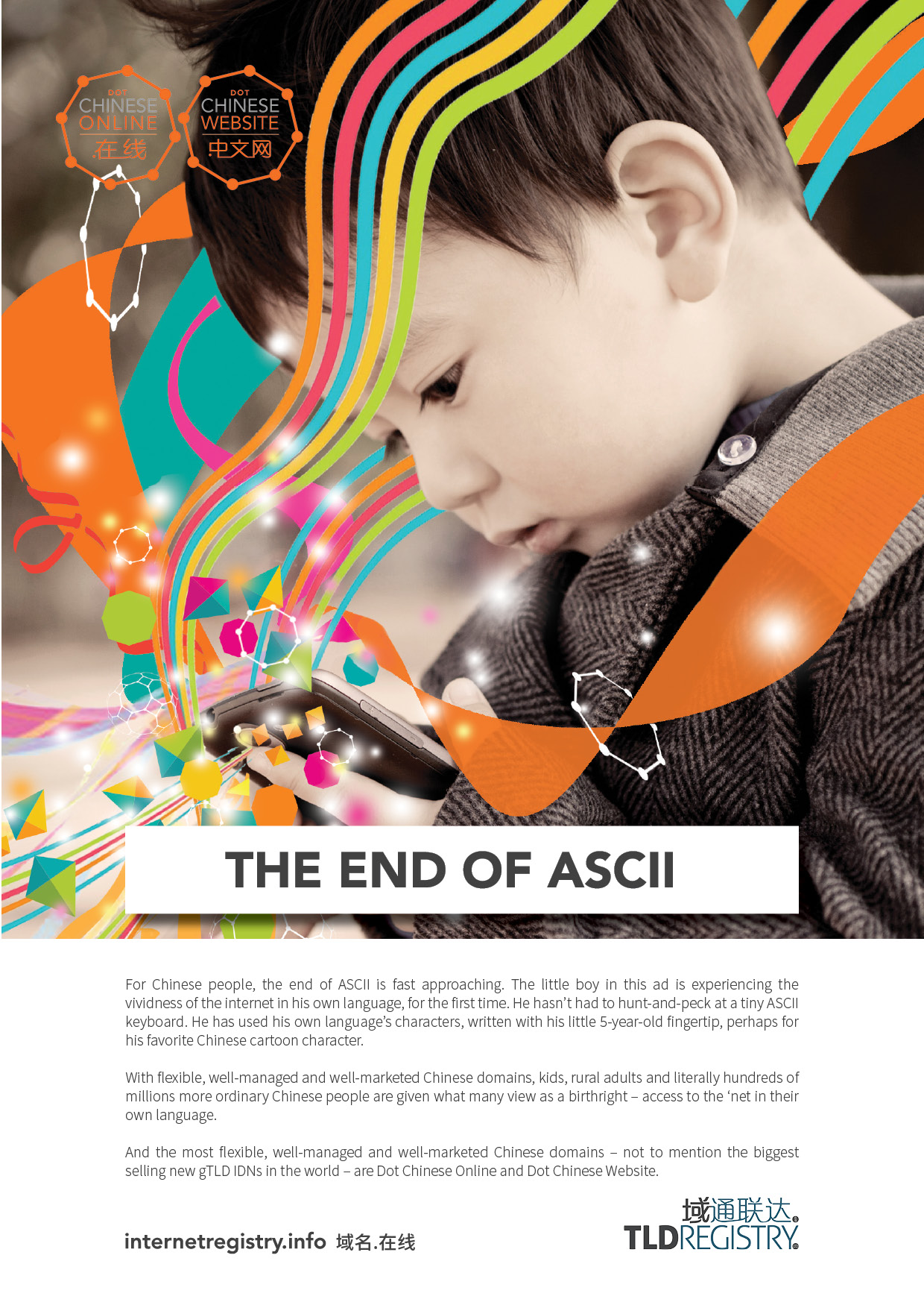 TLD Registry took advantage of the IoN launch to initiate a new series of full-page advertisements, “The End of ASCII” - dedicated to bringing awareness to a digital divide manifested from the lack of universal access (and partly solved by our fully-Chinese domain names!)